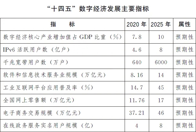 到2025年,数字经济迈向全面扩展期,数字经济核心产业增加值占GDP比重达到10%,数字化创新引领发展能力大幅提升,智能化水平明显增强,数字技术与实体经济融合取得显著成效,数字经济治理体系更加完善,我国数字经济竞争力和影响力稳步提升。