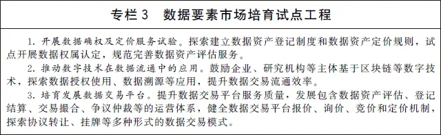 (二)加快数据要素市场化流通。加快构建数据要素市场规则,培育市场主体、完善治理体系,促进数据要素市场流通。鼓励市场主体探索数据资产定价机制,推动形成数据资产目录,逐步完善数据定价体系。规范数据交易管理,培育规范的数据交易平台和市场主体,建立健全数据资产评估、登记结算、交易撮合、争议仲裁等市场运营体系,提升数据交易效率。严厉打击数据黑市交易,营造安全有序的市场环境。