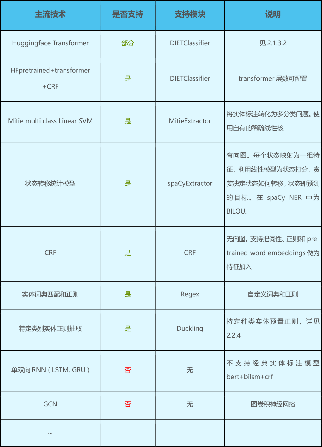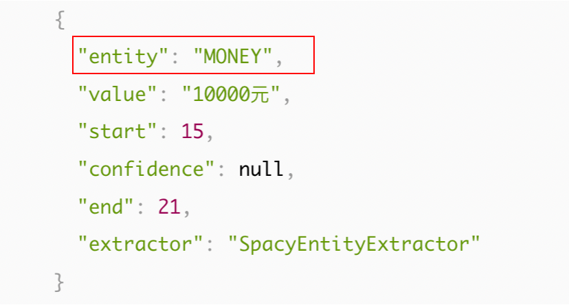 SpaCyNLP 使用统计BILOU转换模型。SpacyEntityExtractor只能使用内置的NER模型,不支持重新训练新模型,而且模型输出无置信度分数。