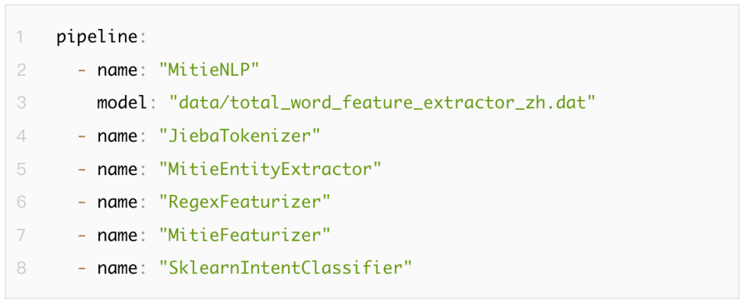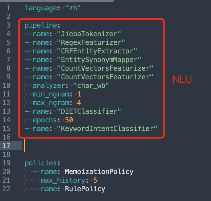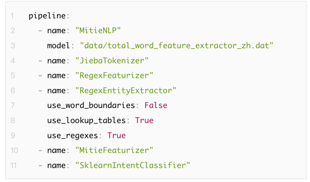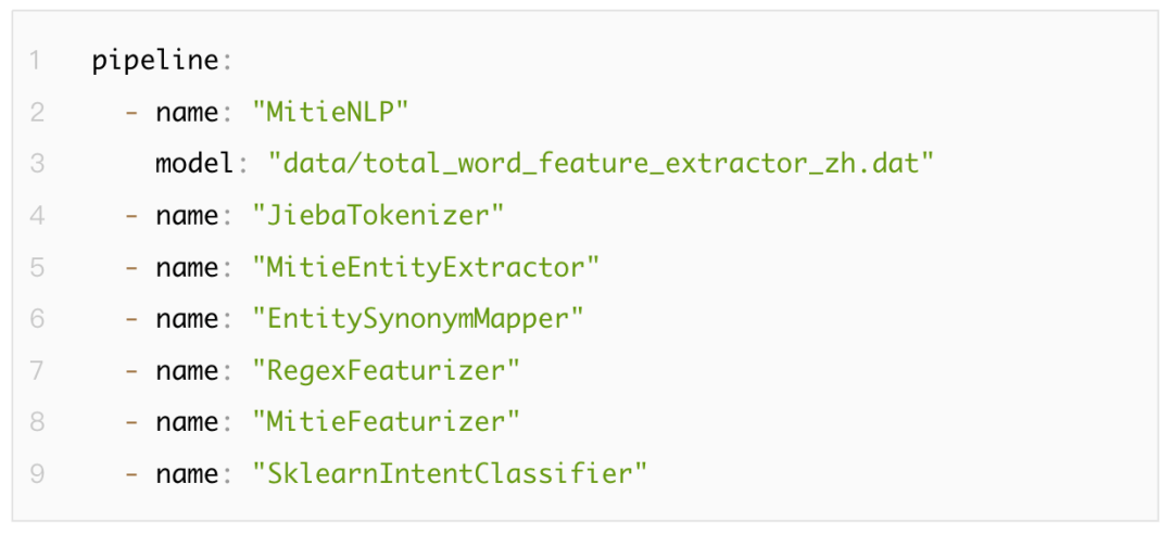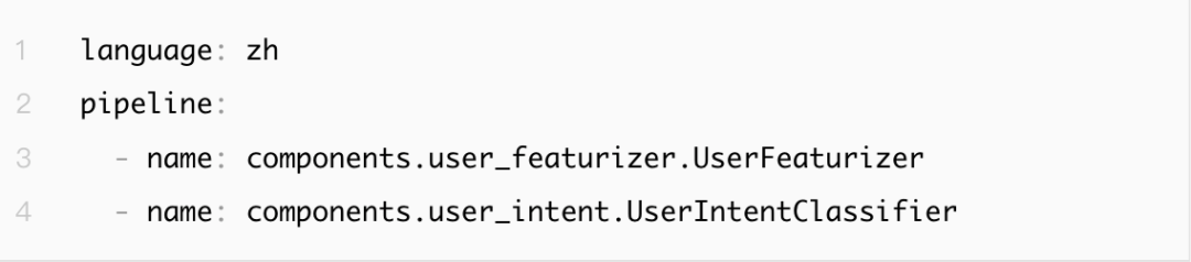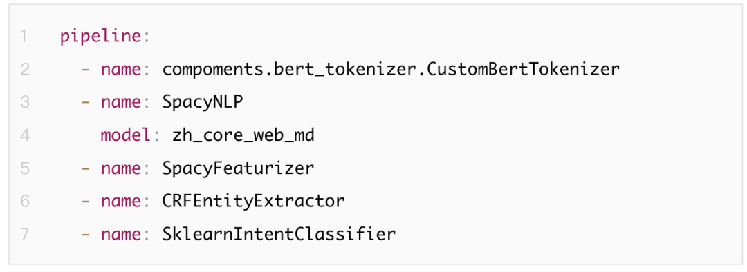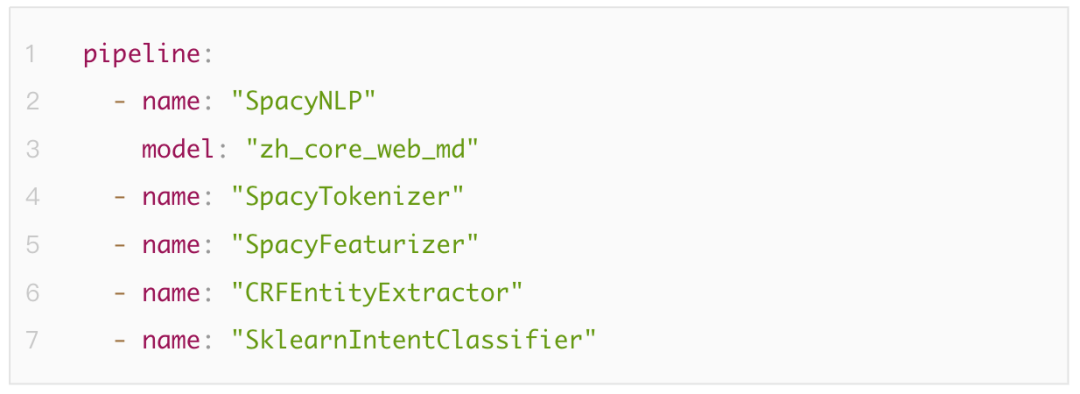 在Rasa中,NLU部分由各功能组件(component)以一定顺序排列形成的pipeline构成。