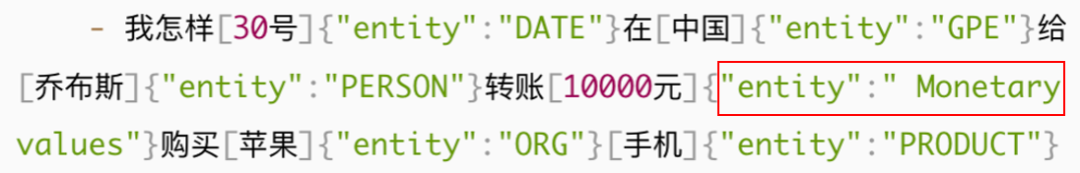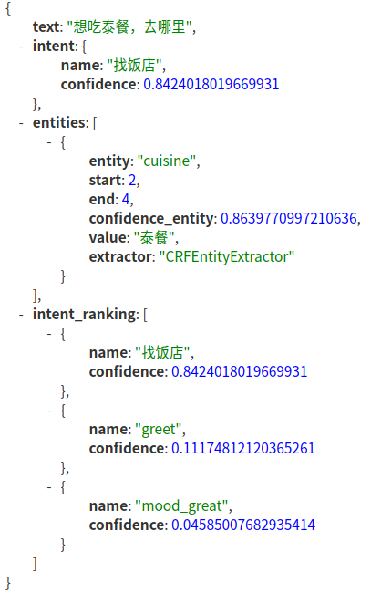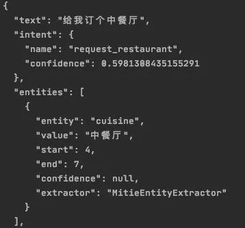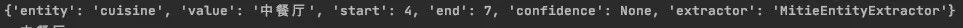 {'text': '可以找到泰餐吗', 'intent': '找饭店', 'entities': [{'start': 4, 'end': 6, 'value': '泰餐', 'entity': 'cuisine'}], 'text_tokens': [...], 'bilou_entities': ['O', 'O', 'U-cuisine', 'O']]}