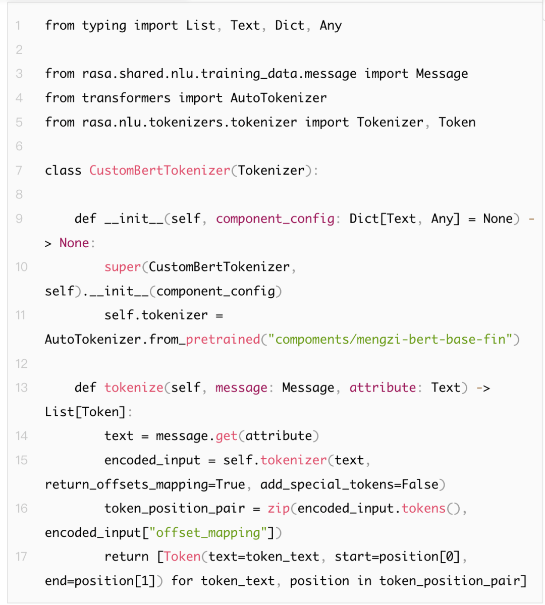 自定义组件可以自主编写代码实现功能或引用现成模型(仍需封装露出train、load、process适配rasa框架),这里需要注意的是,两种方式都需要格外注意数据格式统一的问题: