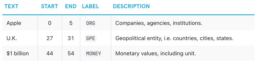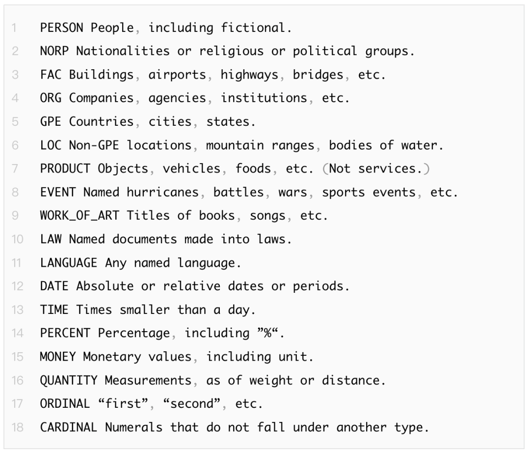 SpacyEntityExtractor配置使用的时候,可以通过dimensions参数指定提取的实体包括的内容,种类如下: