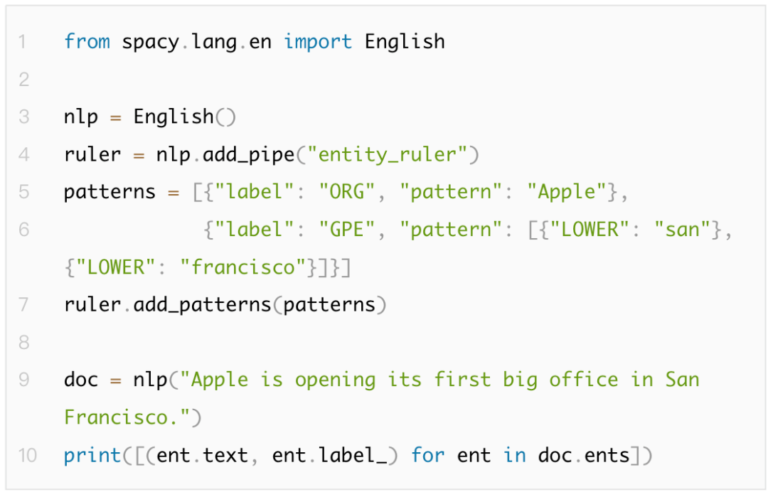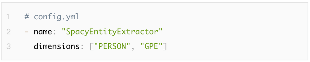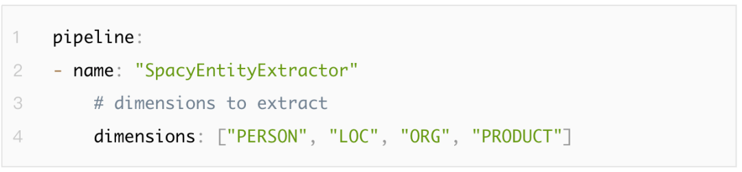 使用SpacyNLP提取命名实体。需要引入SpacyNLP语言模型, SpacyTokenizer, SpacyFeaturizer。