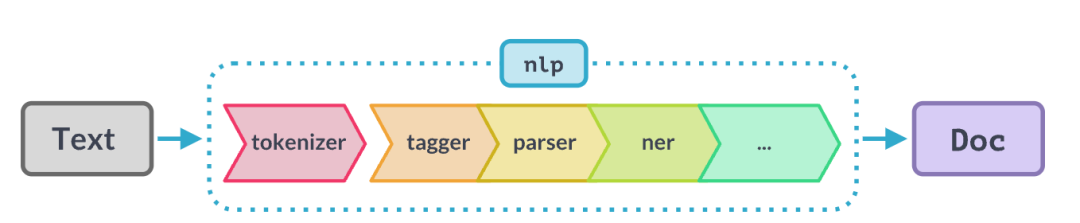 在对文本调用nlp时,spaCy首先标记文本以生成Doc对象。然后,在几个不同的步骤中处理该文档——这也被称为processing pipeline。pipeline通常包括tagger、lemmatizer、parser和entity recognizer。