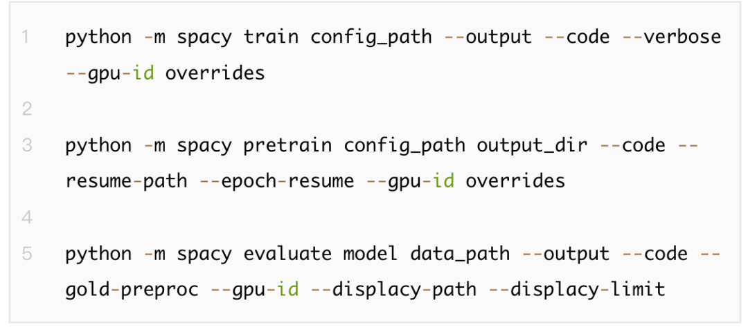 通过命令spaCy train命令训练Spacy pipeline。进行训练需要配置一个包含所有设置和超参数的config.cfg文件。Spacy支持加载Python文件进行自定义训练。