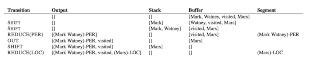 3.构建stack与buffer容器,stack主要用来储存处理之后的spans,buffer用来储存未处理 的tokens。给定parse state的状态,结合贪心算法(支持beam_search)和神经网络预测用于更改parse state的action(状态),当预测到表示实体末尾的action,stack会将标注的实体片段从stack弹出,从buffer继续载入token进入stack进行action预测,直至处理完全部token