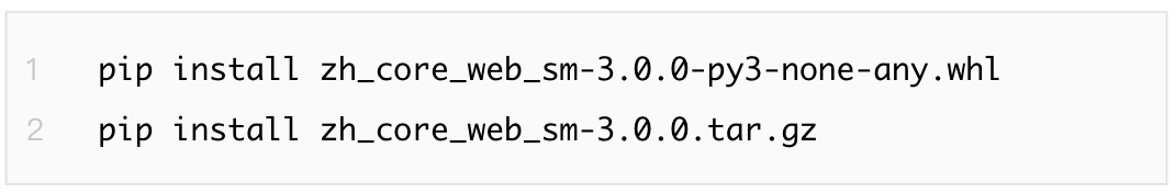 ●首先需要下载Spacy模型文件,可以选择到官方链接(Chinese · spaCy Models Documentation:https://spacy.io/models/zh/)下载模型或自行搜索下载.whl文件或者.tar.gz文件
