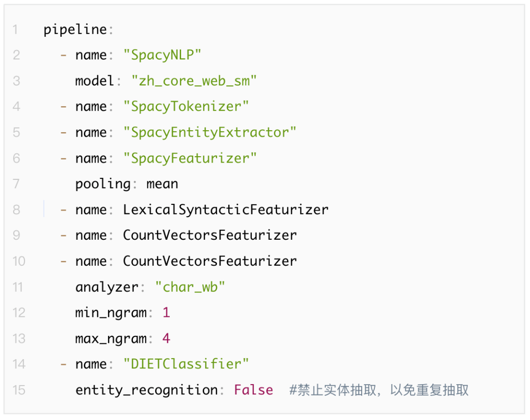 ●Rasa NLU :用于理解用户消息,包括意图识别和实体识别。以pipeline的方式处理用户对话,可在config.yml中配置。