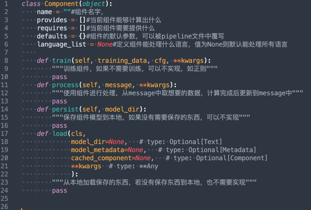 每个组件在pipeline中都需要承上启下,因此除了基本的name组件名外,需要明确其依赖的变量或组件(requires)以及能为后续组件生成提供的数据(provides),defaults中一般规定默认参数,如模型的训练参数、分词器的词典路径等。