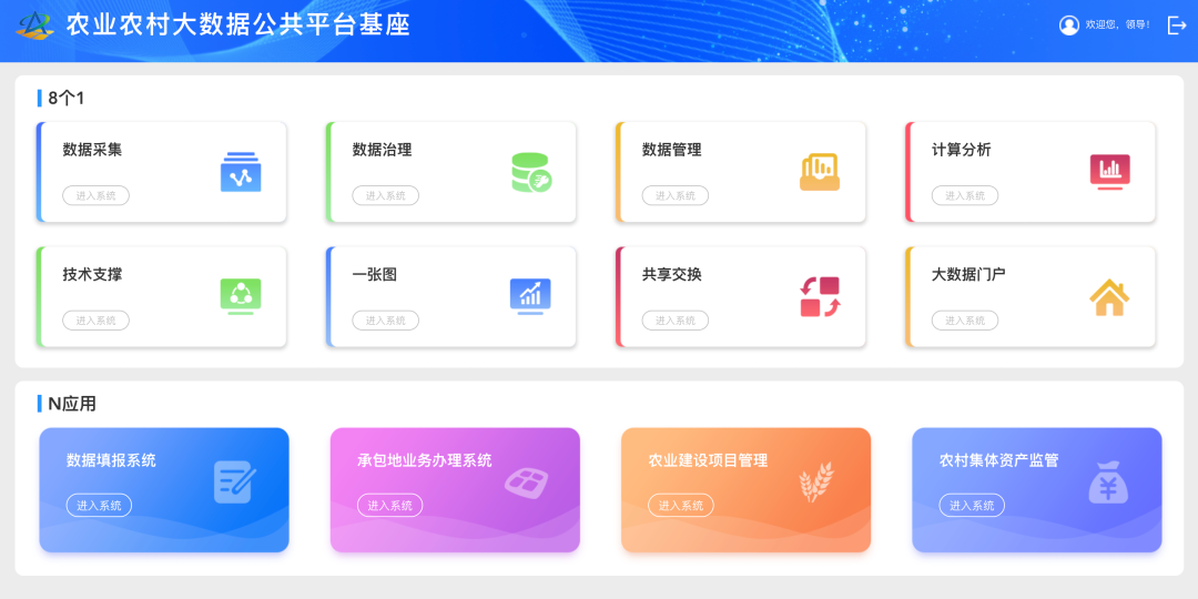 平台基座充分借鉴了尊龙凯时信息在各地农业农村大数据平台建设先进经验,采用行业领先的技术架构和自主可控的国产化技术路线,构建了“1+8+N”的产品形态。“1”是一套农业农村大数据平台的标准规范体系,为平台开发建设和数据融会贯通提供了准则;“8”是数据采集、数据治理、数据管理、计算分析、技术支撑、共享交换服务、大数据“一张图”、服务门户等八个功能模块集,为搭建农业农村大数据资源中心及拓展各类场景应用提供基础支撑;“N”是各类基础应用和扩展应用,为各级农业农村部门开展业务工作提供定制化、便捷化、精准化服务。