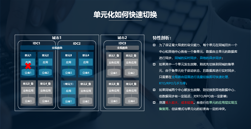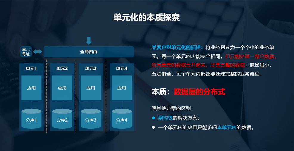 什么是单元化?单元化的本质是数据层的分布式。通过将业务划分为独立,功能相同的业务单元,并且每个单元内部都可以处理完整的业务流程,所有单元的数据合并形成完整的数据,这是对单元化的准确描述。理论上单元化是一个架构级的解决方案,因为实现单元化的前提是需要单元寻址,通过全局路由首先确定业务需要访问和处理的单元。所以单元化相比后面提到的“轻量化”解决方案,对业务层的侵入和影响要大很多。