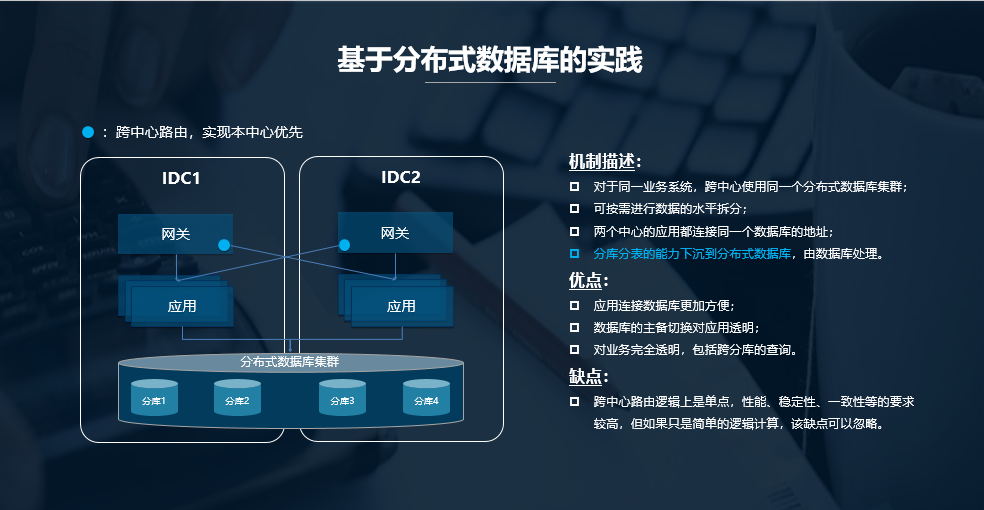 “轻量级”解决方案的优势在于,一是架构简洁,只需要对数据进行分库处理,不会对应用层带来入侵。二是针对跨中心的访问,可以通过应用层跨中心路由实现,规避跨中心的数据访问,并轻量级解决跨分库查询的问题。三是应用实例完全对等,单个故障几乎无影响,实现高可靠性。但同样对跨中心路由的性能、稳定性、一致性等的要求较高,如果只是简单的逻辑计算,该缺点可以忽略。